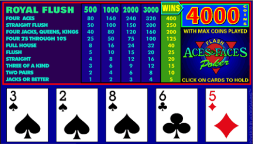 Aces & Faces is a video poker game which is based on 8/5 Jacks or Better. It has an increased payout for 4 of a kind with Ace & Face cards. It is an easy to play, cool, standard video poker game suitable for all kinds of players. The aim of this game is to beat the machine (by securing a better and obviously more valuable hand than it draws). There are no wild cards and the maximum payout is 4,000 coins