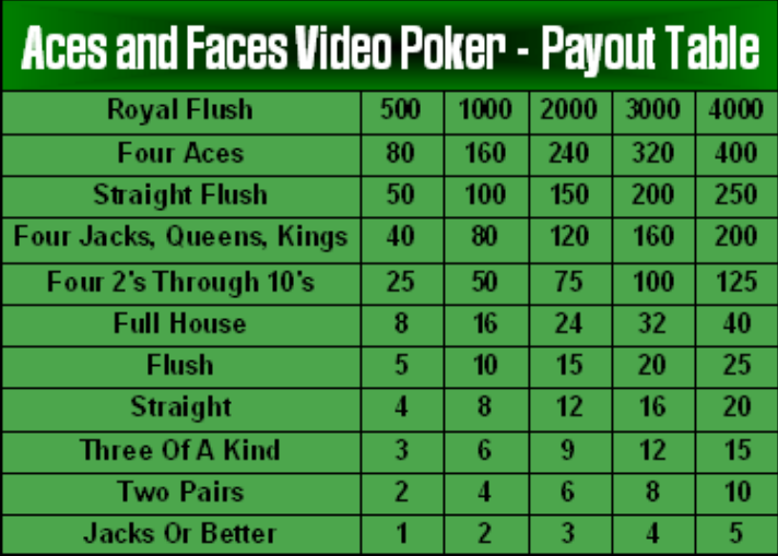 - The payoff on this game are tied to combinations of face cards and aces starting with a pair of Jacks and has higher payouts for 4 of a kind combinations in Aces, Kings, Queens and Jacks. There are no wild cards in the game.